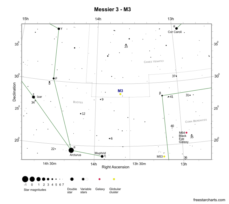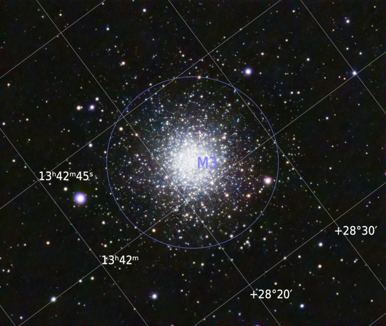M3 (NGC5272) est un amas globulaire des Chiens de Chasse. Il s’agit du premier objet du catalogue découvert par Charles Messier en 1764.