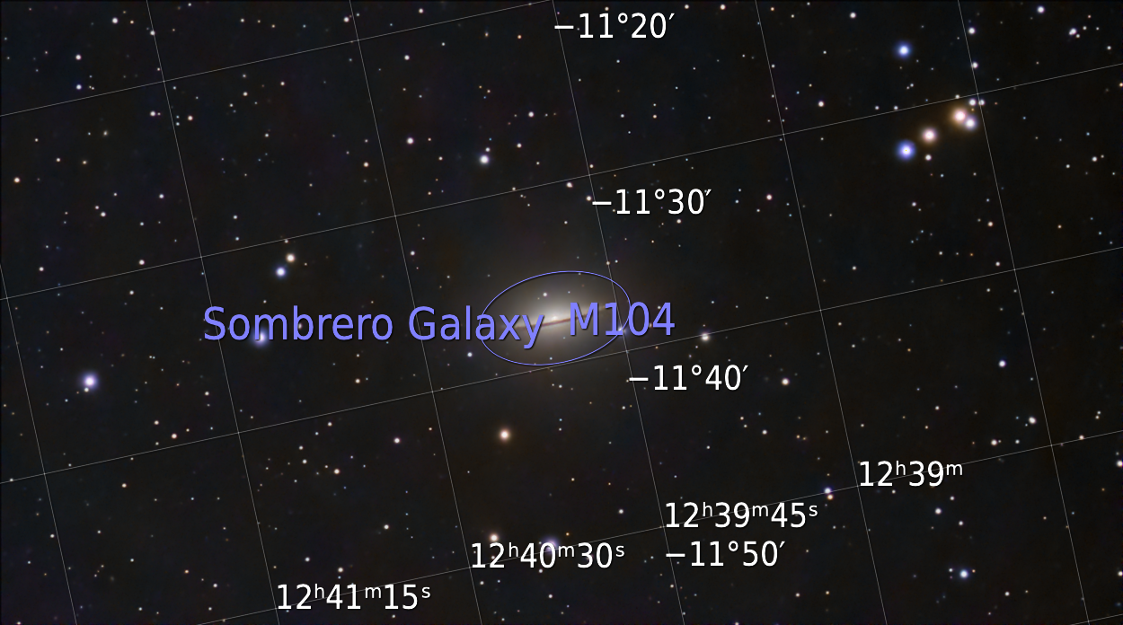 M104 (NGC 4594, aussi appelé la galaxie du Sombrero) est une galaxie spirale vue par la tranche située dans la constellation de la Vierge.